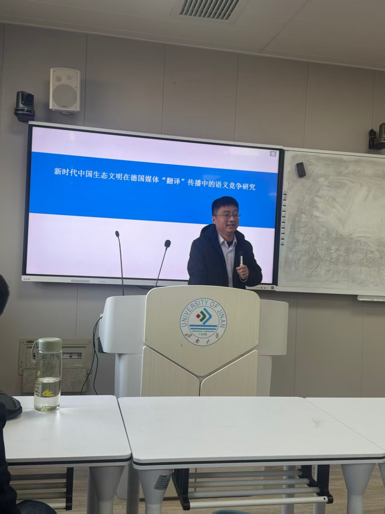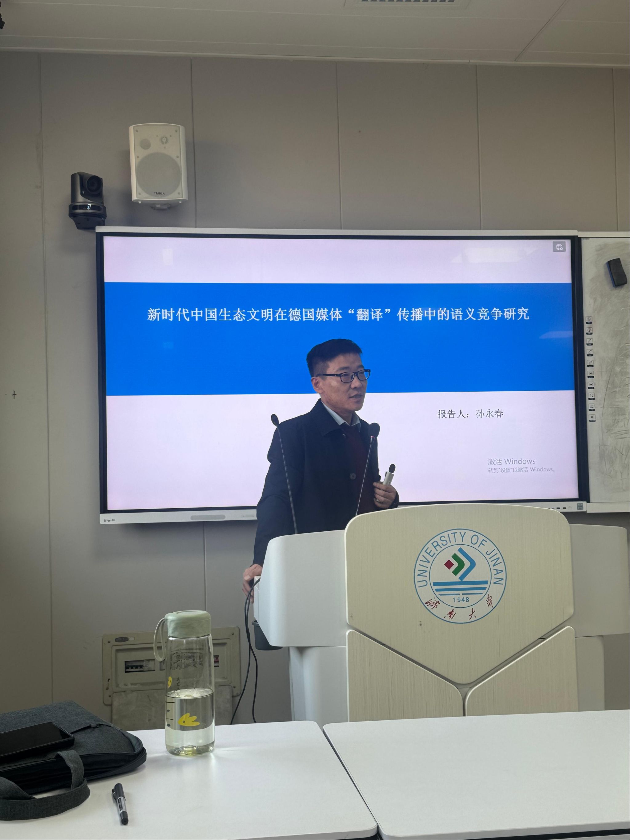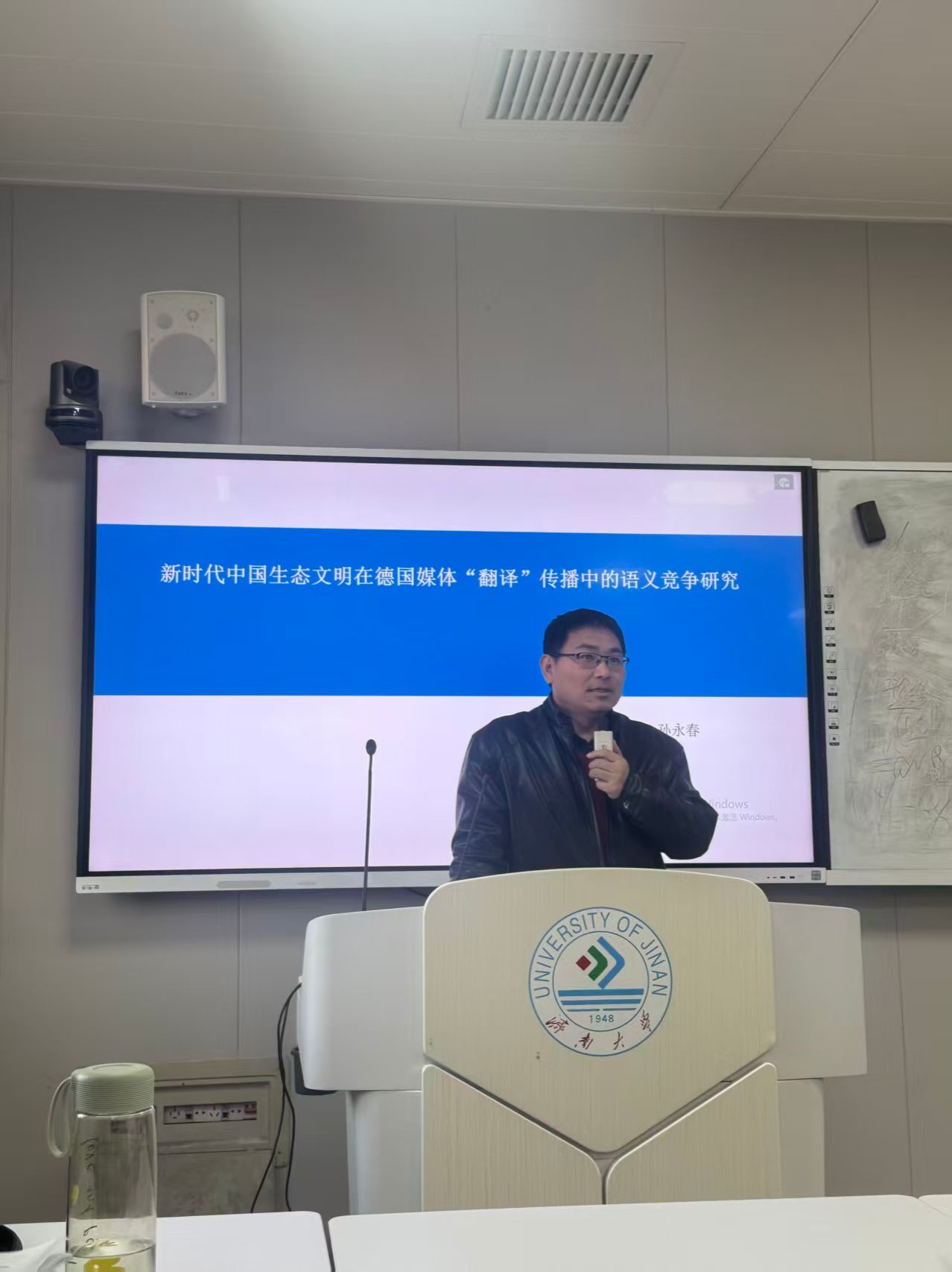 在随后的讲座中,孙永春系统地介绍了其研究成果。他从习近平生态文明思想的内涵出发,梳理了相关理念在国际传播研究中的现状与前沿动态。讲座围绕研究目标的设定、研究方法的选择以及语料库的建设与应用展开,深入剖析了中国生态文明相关概念在德国媒体翻译与传播过程中出现的语义竞争现象。他通过具体的案例分析,生动阐释了不同话语体系对核心概念的理解与转换差异,并探讨了有效的话语传播路径与策略,为提升中国生态文明理念在全球范围内的传播提供了学术支撑。整场报告逻辑严谨,层次清晰,为在场的师生们呈现了一场精彩纷呈的学术盛宴。