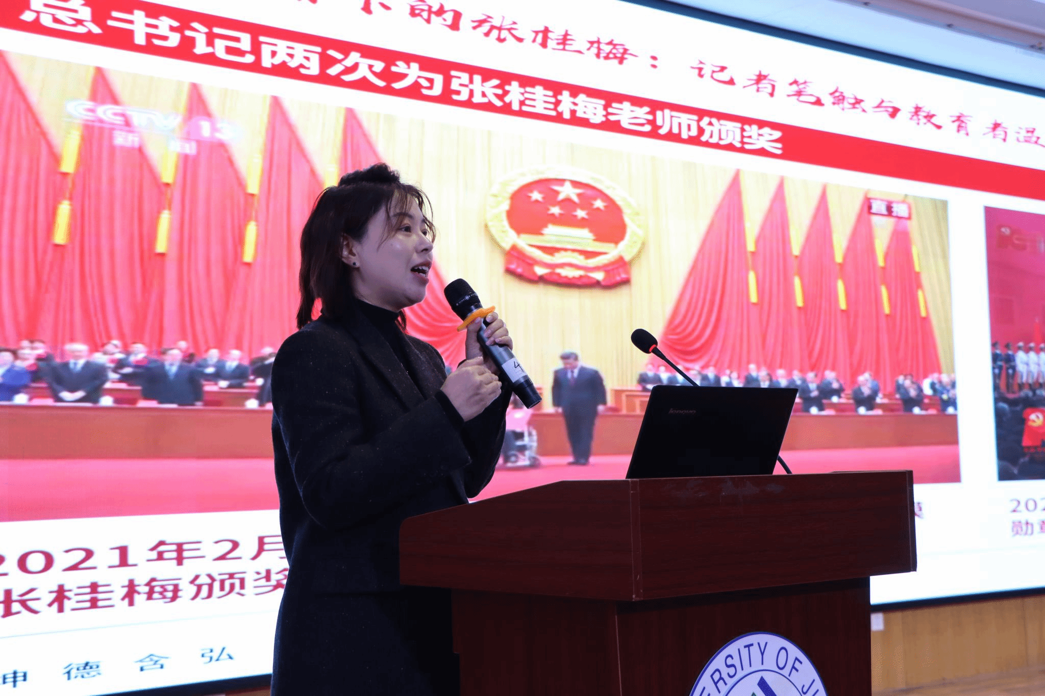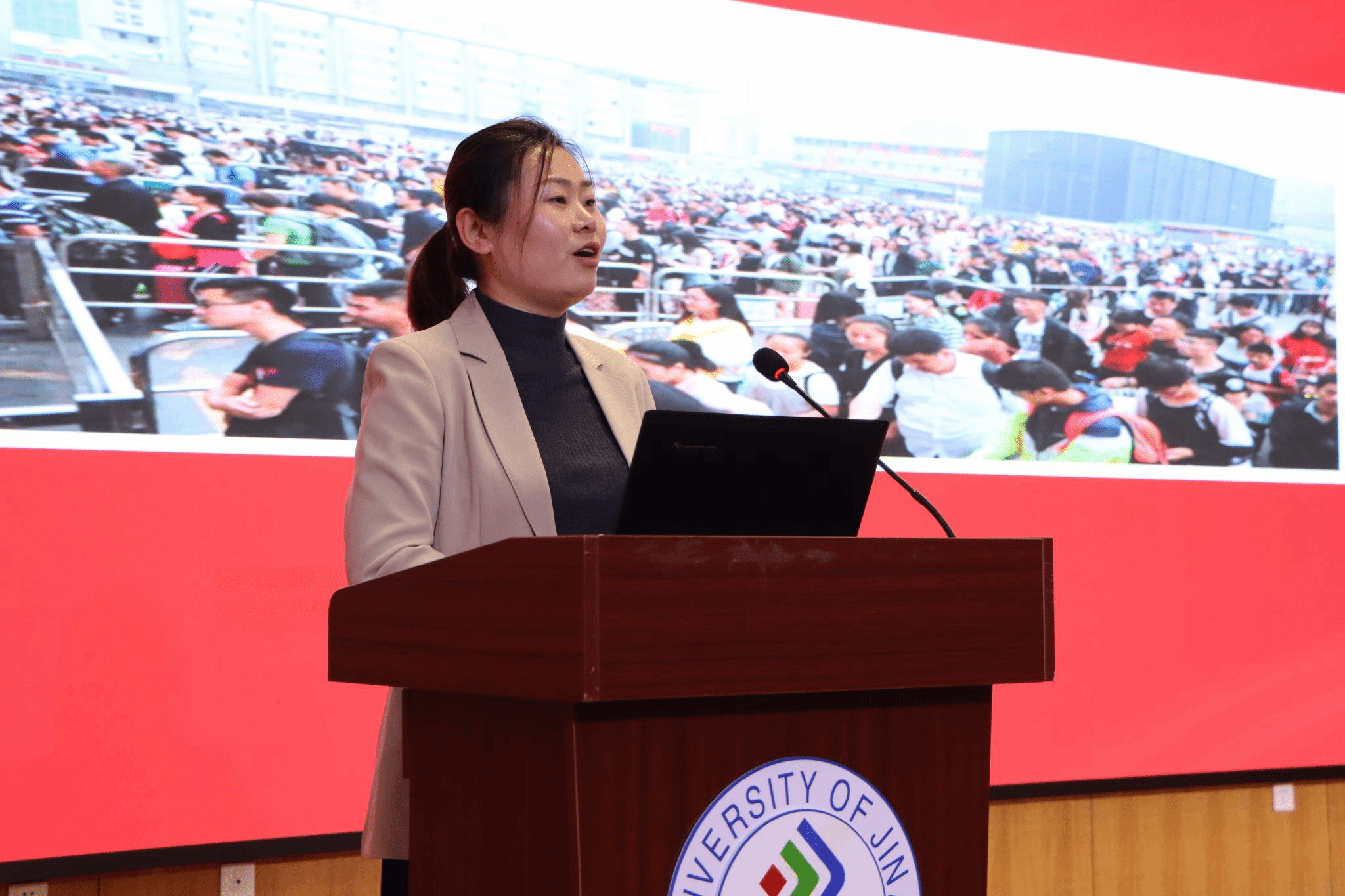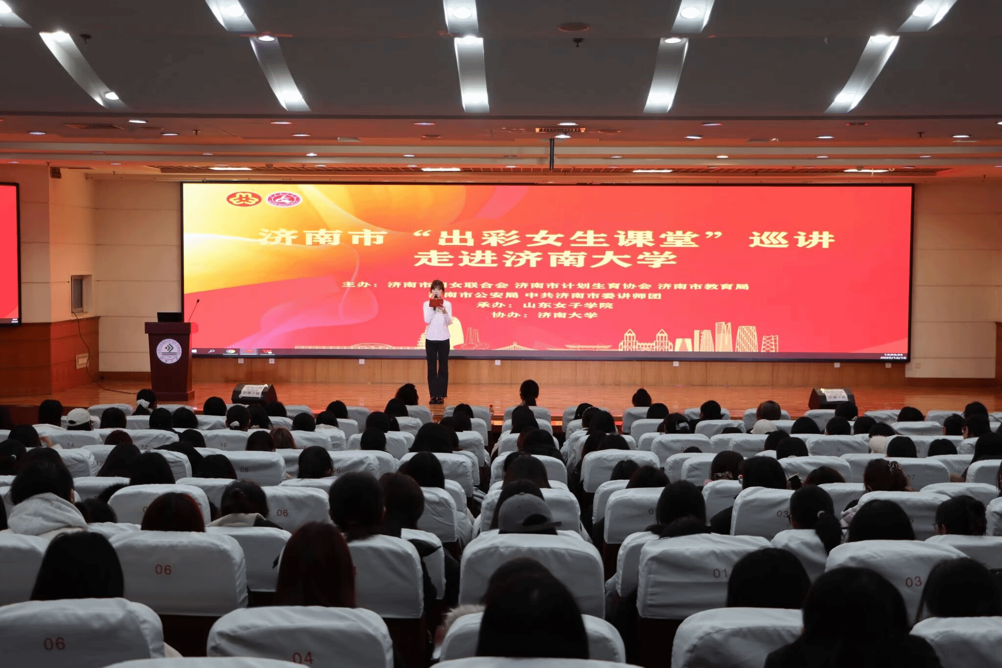 12月16日,2025年济南市“出彩女生课堂”巡讲活动走进济南大学,济南大学外国语学院300余名女大学生参加活动。