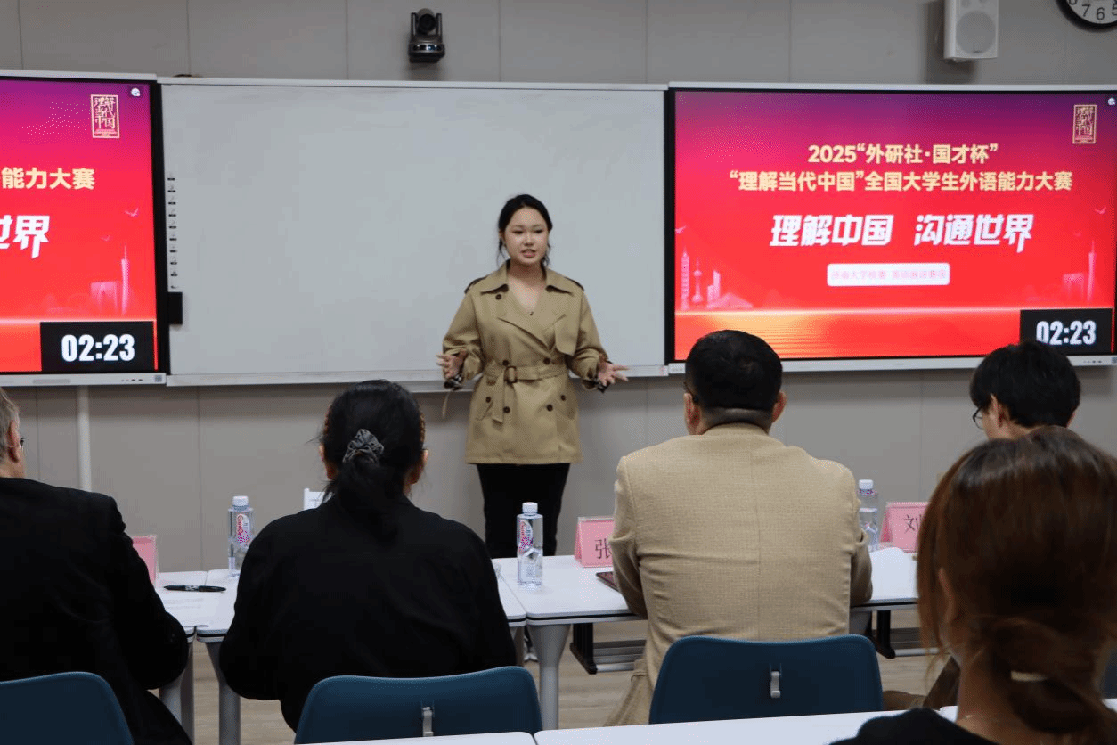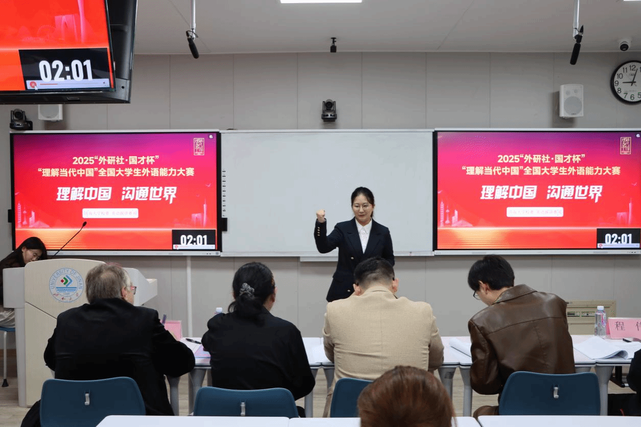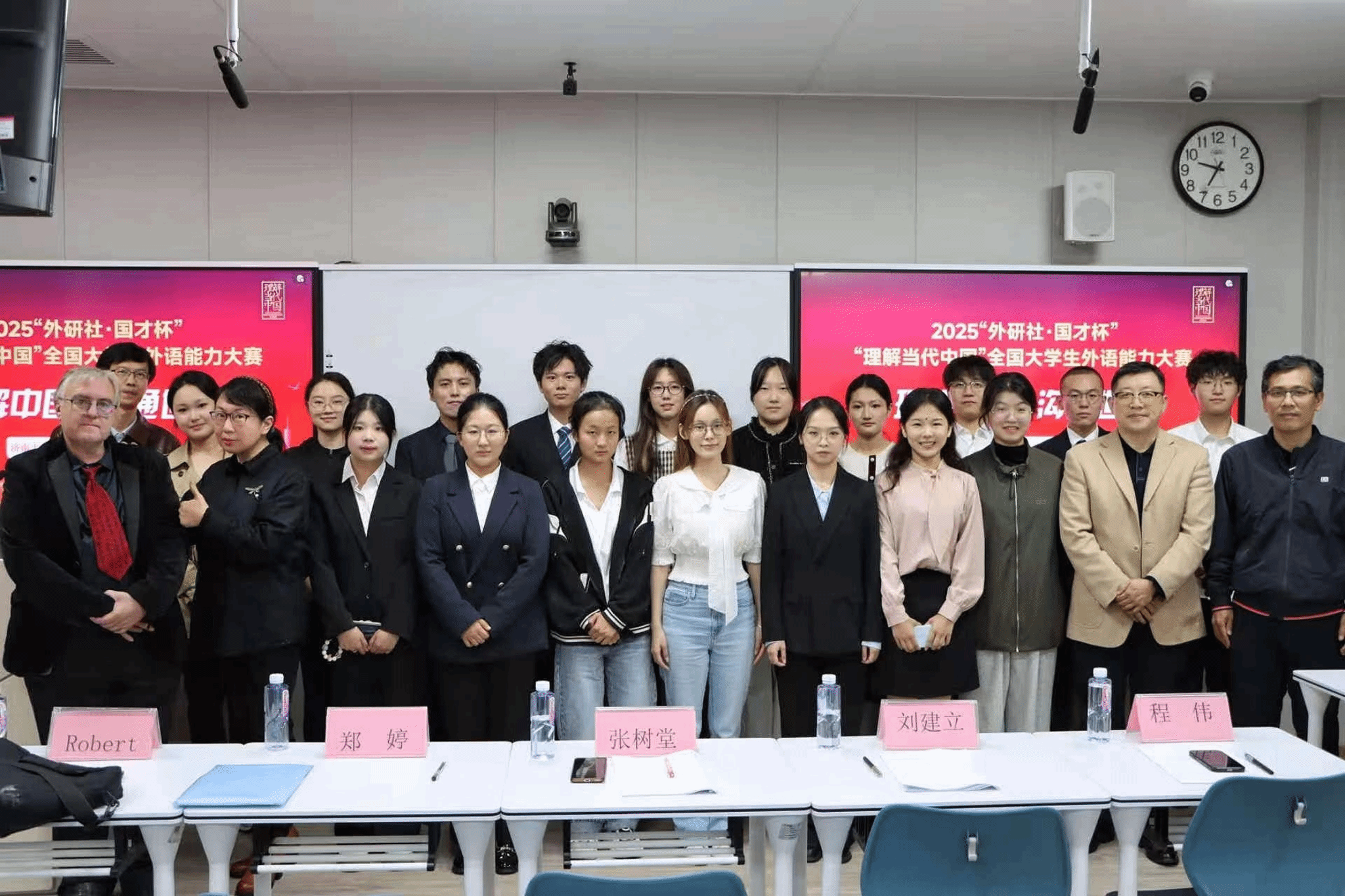 10月15日晚, 2025年“外研社·国才杯”“理解当代中国”全国大学生外语能力大赛英语演讲大赛校园赛在第一教学楼505成功举办。来自全校各学院的21名晋级选手同台竞技,他们在比赛现场各放异彩,展开了激烈又精彩的角逐。本次比赛邀请了外国语学院张树堂、郑婷、刘建立、程伟和外籍教师Robert担任评委。