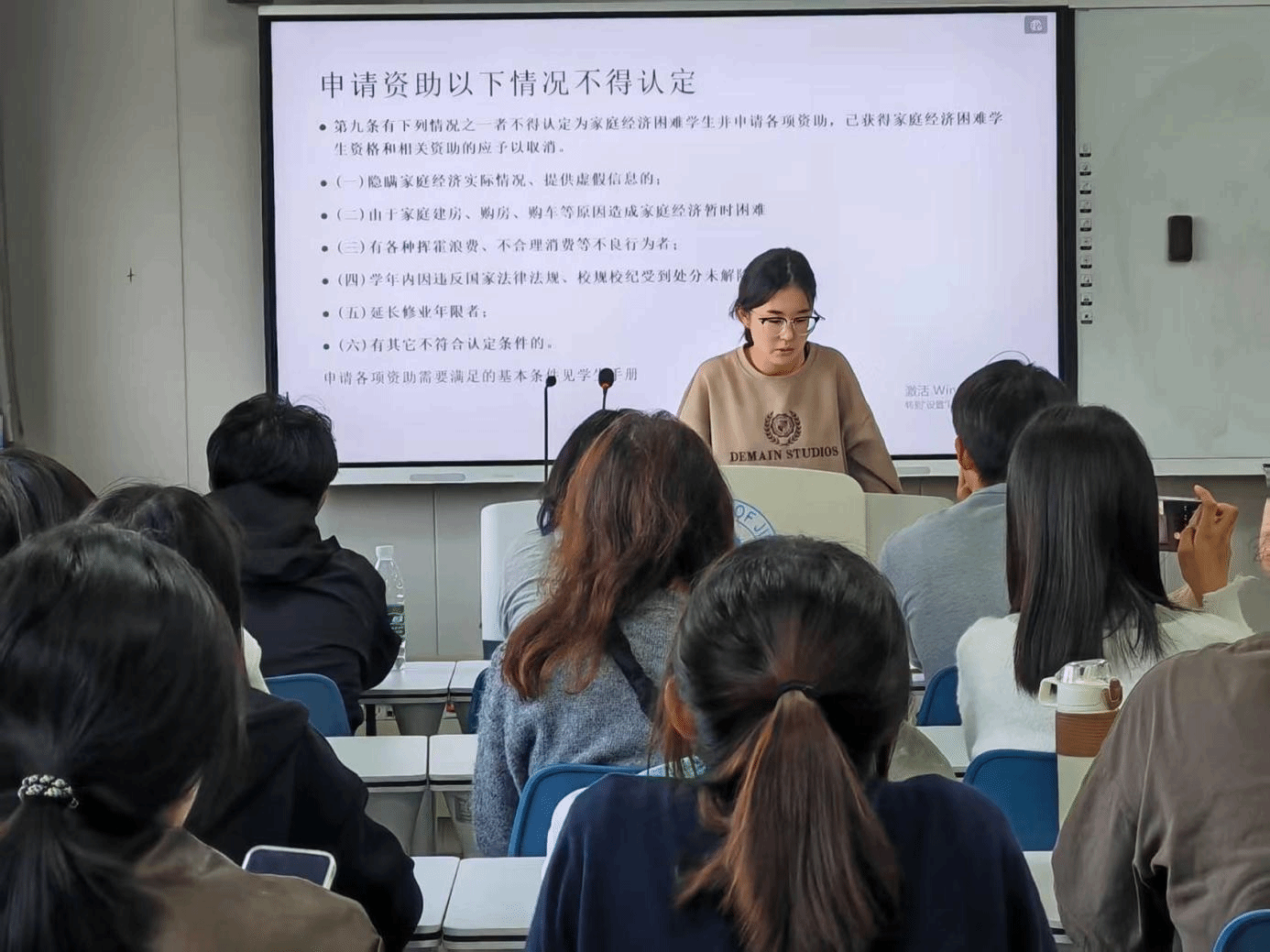 随后,顾睿向同学们讲解了家庭经济困难认定的申请流程、材料准备及要求、注意事项等。
