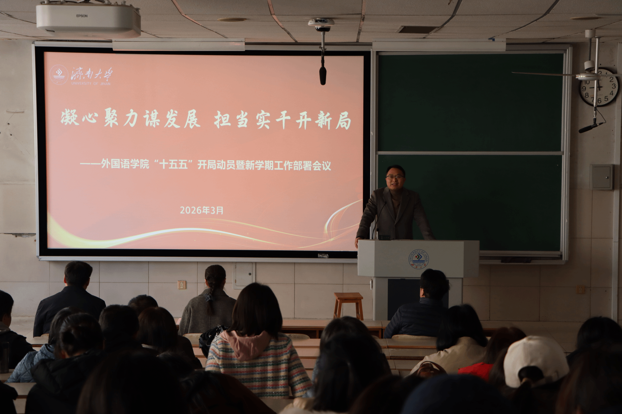 学院党委书记郭英传达了中共济南大学第四届八次全委会扩大会议精神,并带领大家学习了学校党委书记刘春华所作的题为《靶向发力求突破担当尽责促发展确保“十五五”高起点开局起步》的工作报告。她指出,2026年是实施“十五五”规划的开局之年,也是落实学校第四次党代会部署的关键之年,全院教工要进一步提高思想认识,凝聚共识,将行动切实落实到学校与学院的发展蓝图之中。随后,围绕2026年党建重点工作、师德师风建设、安全稳定等方面工作进行了安排。