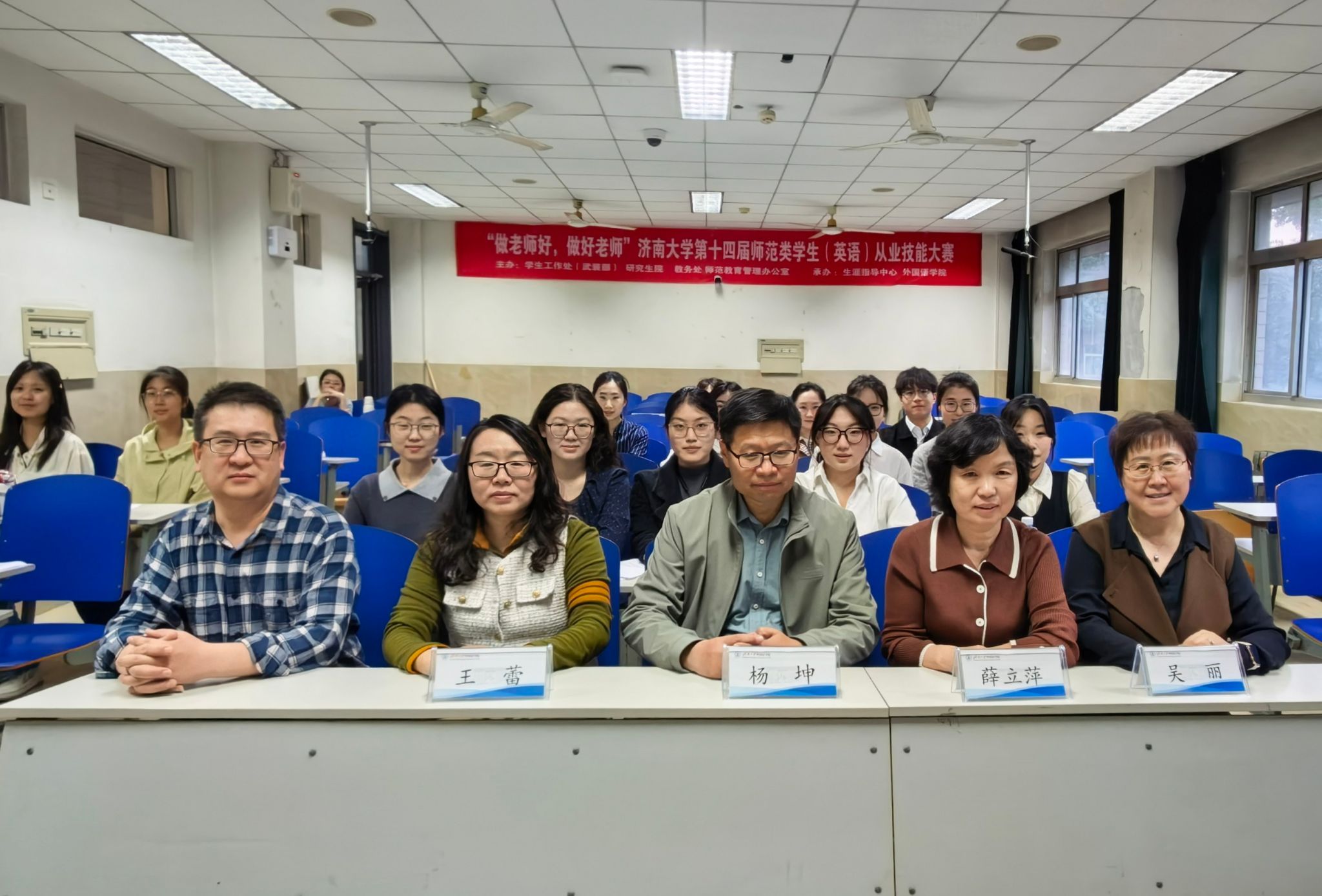 4月11日,由党委学生工作部(处)、党委研究生工作部主办,外国语学院承办的济南大学第十四届师范类高校学生从业技能大赛(英语专业)校级决赛举办。俊德实验学校杨坤、七贤中学薛立萍、育贤中学王蕾和外国语学院吴丽担任此次比赛的评委。外国语学院副院长王勇,2023级本科生辅导员刘毅以及指导教师团队负责人程瑞勇参加活动。